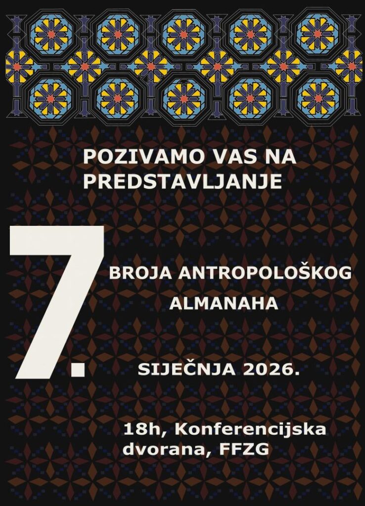 S velikom radošću pozivamo vas na predstavljanje sedmog broja časopisa Antropološki almanah koje će se održati 7. siječnja 2026. godine u 18 sati u konferencijskoj dvorani Knjižnice Filozofskog fakulteta Sveučilišta u Zagrebu.